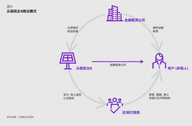 與民企 A 大量資產(chǎn)自持模式不同,民企 B 打造了一條輕資產(chǎn)模式(如圖 8):引入金融租賃公司授信托底,自己則作為開發(fā)方賺取差價(jià),同時(shí)提供帶運(yùn)維服務(wù)以獲得持續(xù)的管理費(fèi)收入。民企B的核心優(yōu)勢在于其家電業(yè)務(wù)所積累的廣泛渠道資源,與此同時(shí),通過大幅度讓利經(jīng)銷商并提供更快付款節(jié)奏,公司在前期搶占了部分市場資源。