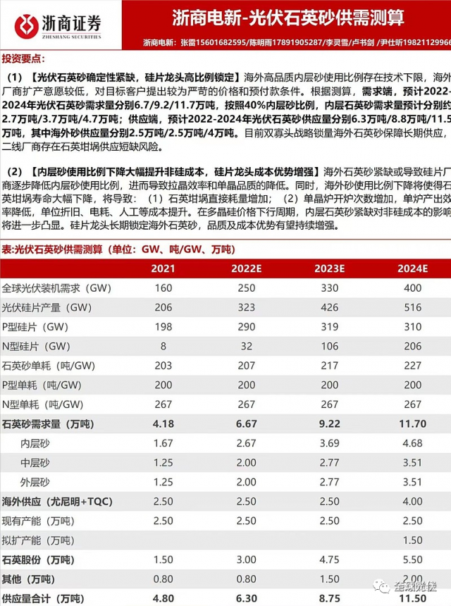 ②據(jù)行業(yè)專家,100GW硅片對(duì)應(yīng)2-3萬(wàn)噸石英砂,內(nèi)中外層的用量占比為4:3:3。據(jù)CPIA,2023年全球新增光伏裝機(jī)248GW。假設(shè)全產(chǎn)業(yè)鏈后道環(huán)節(jié)零損耗,零庫(kù)存,則對(duì)應(yīng)石英砂的最小用量為6.20萬(wàn)噸,對(duì)應(yīng)內(nèi)中、外層砂用量4.34萬(wàn)噸/1.86萬(wàn)噸。