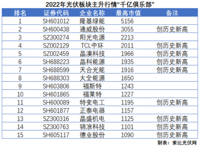 令人欣喜的是,主升階段“光伏千億俱樂部”擴容至15家,其中隆基綠能行業(yè)龍頭地位依舊穩(wěn)固,最高市值達到5156億;通威股份、TCL中環(huán)總市值歷史首次突破3000億和2000億大關(guān);陽光電源依然穩(wěn)坐逆變器頭把交椅,最高市值達到2213億元;晶澳科技、晶科能源、天合光能三大組件龍頭最高市值均超過1900億。