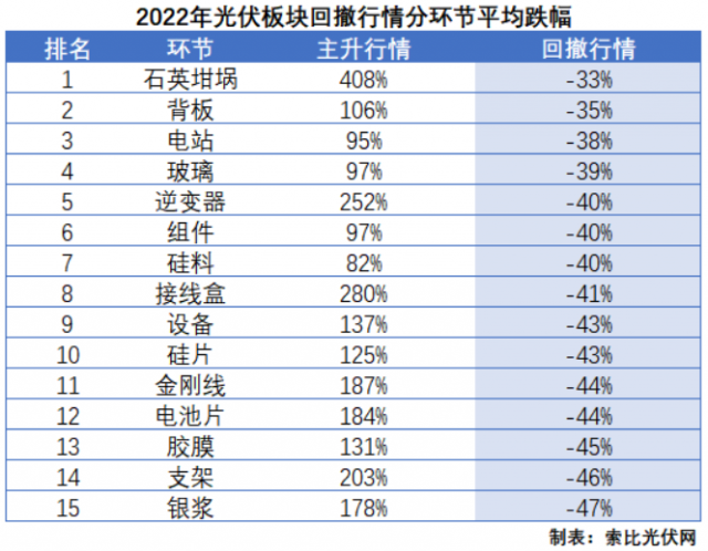 回撤行情中,石英坩堝、背板、電站平均回撤最小,分別為33%、35%和38%,而銀漿、支架、膠膜回撤幅度最大,分別達到47%、46%和45%。