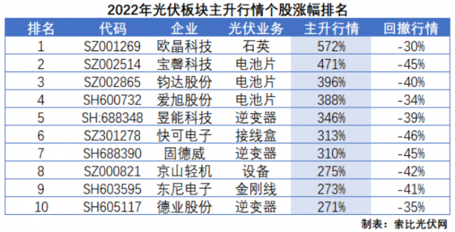 個股方面,次新、電池片以及逆變器漲幅居前。其中,年內(nèi)上市的“石英坩堝第一股”歐晶科技、微逆龍頭昱能科技、接線盒翹楚快可電子漲幅分別達到572%、346%和313%;跨界HJT和TOPCon的寶馨科技和鈞達股份漲幅分別達到471%和396%,主打ABC電池技術(shù)路線的愛旭股份漲幅達到388%;光儲逆變器頭部廠商固德威和德業(yè)股份漲幅分別達到310%和271%。