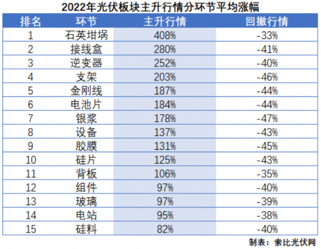 在漲幅居前的環(huán)節(jié)中,石英坩堝受益于高純石英砂緊缺以及市場需求爆發(fā),產(chǎn)品呈現(xiàn)“量價齊升”的局面,尤其是高純石英砂價格,年內(nèi)漲幅超過150%。逆變器受益于歐洲戶用光儲市場的全面爆發(fā),以及相對穩(wěn)定的競爭格局,頭部企業(yè)出貨量大超市場預期。