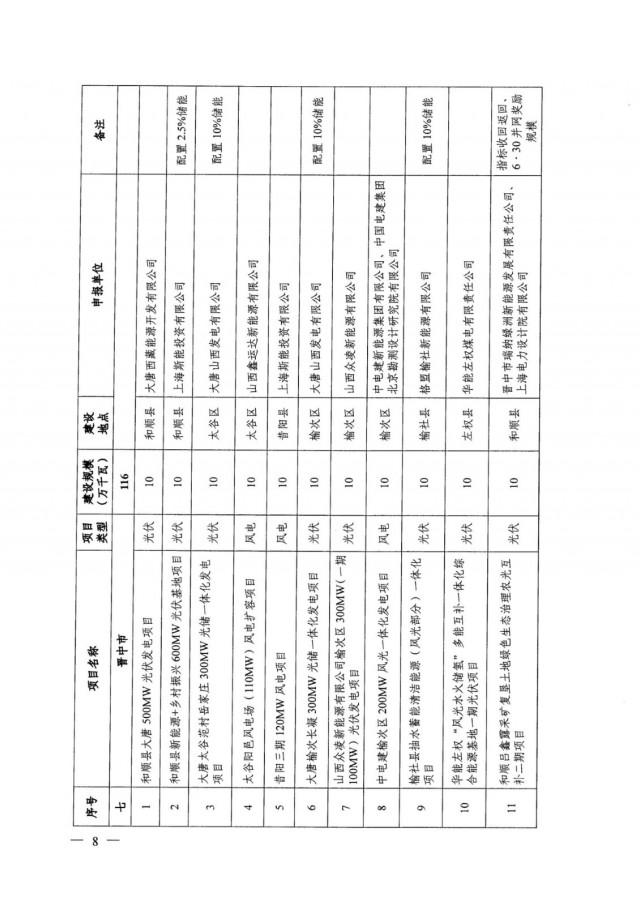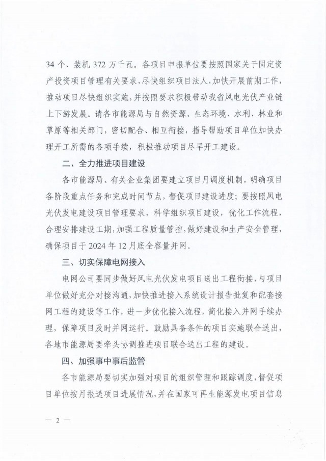 支持新能源產(chǎn)業(yè)發(fā)展項(xiàng)目34個(gè),裝機(jī)372萬千瓦(3.72GW)。其中,光伏項(xiàng)目16個(gè),風(fēng)光一體項(xiàng)目1個(gè)(含光伏6萬千瓦),涉及光伏項(xiàng)目共197萬千瓦(1.97GW)。要求確保項(xiàng)目于2024年12月底全容量并網(wǎng)。
