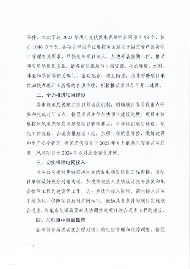 具體看,保障性并網(wǎng)項(xiàng)目98個(gè),裝機(jī)1046萬千瓦(10.46GW)。其中,光伏項(xiàng)目68個(gè),裝機(jī)741萬千瓦(7.41GW),風(fēng)光儲(chǔ)一體項(xiàng)目2個(gè),裝機(jī)共25萬千瓦。要求確保光伏項(xiàng)目于2023年9月底前全容量并網(wǎng)發(fā)電。