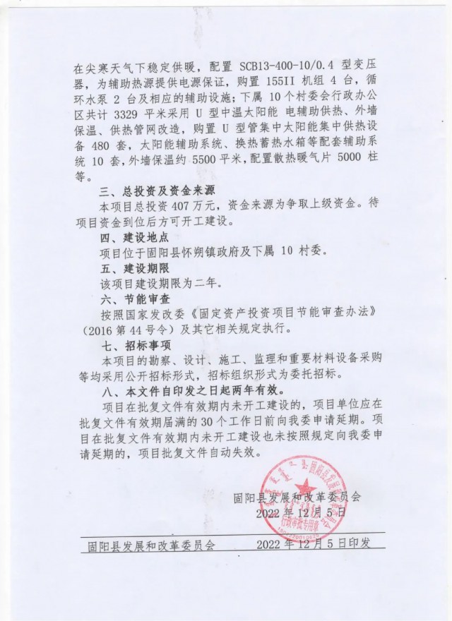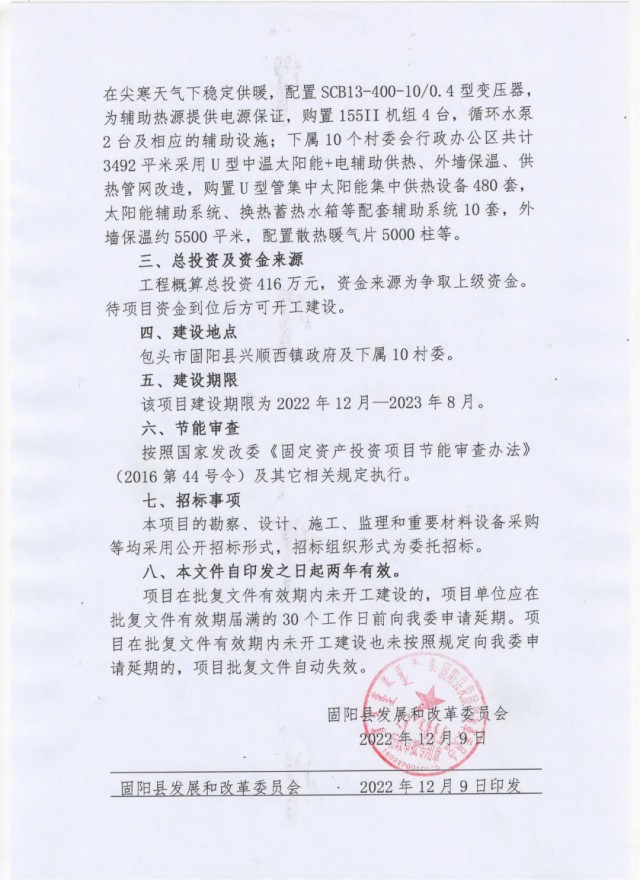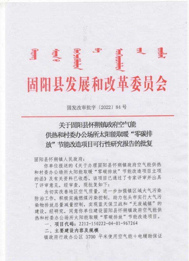 《固陽縣懷朔鎮(zhèn)政府空氣能供熱和村委辦公場所太陽能取暖"零碳排放”節(jié)能改造項目批復公示》