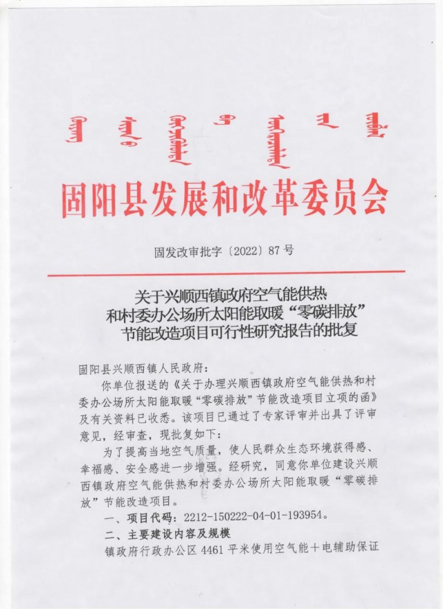 《固陽縣興順西鎮(zhèn)政府空氣能供熱和村委辦公場所太陽能取暖“零碳排放”節(jié)能改造項目批復公示》