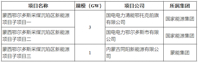 蒙西鄂爾多斯采煤沉陷區(qū)新能源項(xiàng)目共分三個(gè)子項(xiàng)目。其中,國(guó)家能源集團(tuán)獲得兩個(gè)子項(xiàng)目,總規(guī)模為3GW,蒙能集團(tuán)獲得一個(gè)子項(xiàng)目,規(guī)模為1GW。