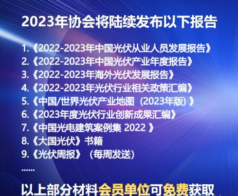 除了兩份報(bào)告以外,協(xié)會(huì)還將發(fā)布《2022-2023年中國(guó)光伏從業(yè)人員發(fā)展報(bào)告》、《2022-2023年中國(guó)光伏產(chǎn)業(yè)年度報(bào)告》、《2022-2023年海外光伏發(fā)展報(bào)告》、《2022-2023年光伏行業(yè)相關(guān)政策匯編》、《中國(guó)/世界光伏產(chǎn)業(yè)地圖(2023年版)》、《2023年度光伏行業(yè)創(chuàng)新成果匯編》、《中國(guó)光電建筑案例集2022》,以及行業(yè)內(nèi)首本以代表性人物的人生經(jīng)歷為故事主線,講述企業(yè)和行業(yè)跌宕起伏發(fā)展過程的書籍——《大國(guó)光伏》。敬請(qǐng)關(guān)注。