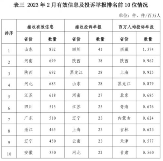 各?。ㄗ灾螀^(qū)、直轄市)按照接收的有效信息數(shù)量排序,山東、河南、陜西、河北、江蘇、四川、廣東、浙江、遼寧、安徽排在全國(guó)前10位;按照接收的投訴舉報(bào)數(shù)量排序,四川、陜西、黑龍江、山東、河南、江蘇、遼寧、上海、云南、河北排在全國(guó)前10位;按照百萬(wàn)人均投訴舉報(bào)數(shù)量排序,西藏、陜西、上海、黑龍江、北京、青海、內(nèi)蒙古、吉林、天津、甘肅排在全國(guó)前10位。(2023年2月有效信息及投訴舉報(bào)排名前10位情況見表三)