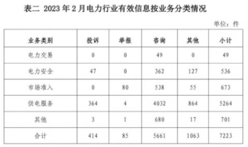 電力行業(yè)排在首位,有效信息數(shù)量為7223件,占全部有效信息的70.37%。群眾關(guān)注的內(nèi)容主要集中在供電服務(wù)、電力安全、成本價(jià)格和收費(fèi)等方面。(2023年2月電力行業(yè)有效信息按業(yè)務(wù)分類情況見表二)