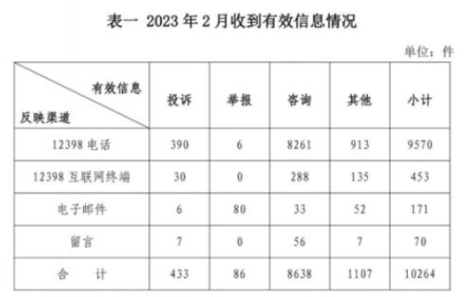 2023年2月,國(guó)家能源局12398能源監(jiān)管熱線(以下簡(jiǎn)稱12398熱線)共收到有效信息10264件(包含投訴、舉報(bào)、咨詢和其他訴求類別),環(huán)比減少27.07%,同比增加22.69%。(2023年2月收到有效信息情況見表一)