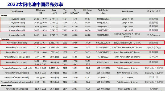2022太陽電池中國(guó)最高效率發(fā)布,隆基綠能共有7個(gè)電池效率入選,占此次效率結(jié)果發(fā)布的近1/2。