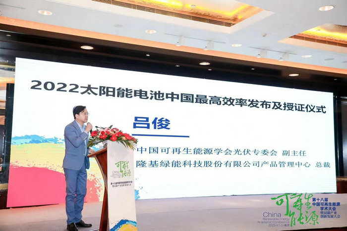 中國(guó)可再生能源學(xué)會(huì)光伏專委會(huì)副主任、隆基綠能產(chǎn)品管理中心總裁呂俊博士進(jìn)行《2022太陽電池中國(guó)最高效率》發(fā)布。