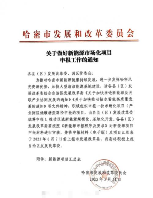 《通知》指出,為推動(dòng)哈密市新能源健康持續(xù)發(fā)展,進(jìn)一步發(fā)揮哈密風(fēng)光資源優(yōu)勢(shì),加快大型清潔能源基地建設(shè),請(qǐng)各縣(區(qū))發(fā)展改革委結(jié)合自治區(qū)發(fā)展改革委《關(guān)于加快推進(jìn)新能源及關(guān)聯(lián)產(chǎn)業(yè)協(xié)同發(fā)展的通知》《關(guān)于加快推動(dòng)抽水蓄能高質(zhì)量發(fā)展的通知》等文件精神,積極組織申報(bào)一批市場(chǎng)化項(xiàng)目(產(chǎn)業(yè)園區(qū)低碳轉(zhuǎn)型路徑申報(bào)的項(xiàng)目,由各縣(區(qū))發(fā)展改革委統(tǒng)籌申報(bào)),推動(dòng)區(qū)域新能源規(guī)?;⒒鼗_(kāi)發(fā)。