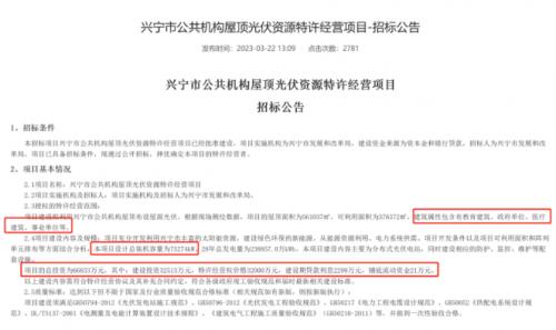 以興寧市招標(biāo)公告為例,招標(biāo)公告顯示,興寧市公共機(jī)構(gòu)屋頂光伏資源特許經(jīng)營(yíng)范圍為利用公共機(jī)構(gòu)屋頂布設(shè)屋頂光伏,規(guī)模為75.274MW,項(xiàng)目的總投資為66833萬(wàn)元,其中:建設(shè)投資32513萬(wàn)元,特許經(jīng)營(yíng)權(quán)價(jià)格32000萬(wàn)元,建設(shè)期貸款利息2299萬(wàn)元,鋪底流動(dòng)資金21萬(wàn)元。按照這一數(shù)據(jù)折算,興寧市整縣光伏單瓦投資成本為8.88元/瓦,對(duì)應(yīng)的特許權(quán)經(jīng)營(yíng)費(fèi)為4.25元/瓦。