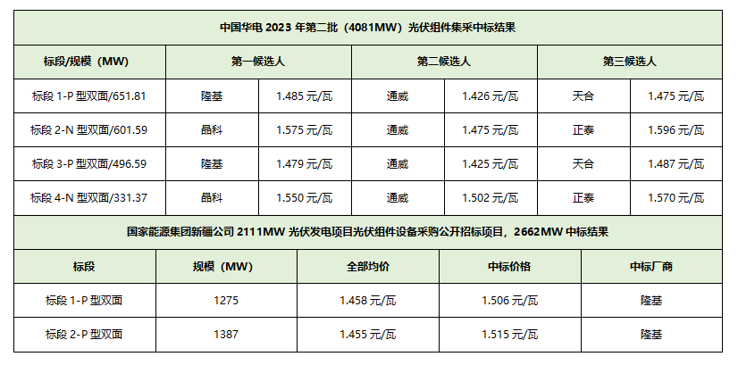 當(dāng)項(xiàng)目落地不再受制于組件價(jià)格,終端發(fā)電企業(yè)將更關(guān)注資產(chǎn)安全伴生的穩(wěn)定收益,“低價(jià)”已不是它們關(guān)注的主要判斷因素。近期中國(guó)華電2023年4081MW光伏組件集采、國(guó)家能源集團(tuán)新疆公司2111MW光伏發(fā)電項(xiàng)目組件設(shè)備采購(gòu)招標(biāo)結(jié)果印證了這種趨勢(shì)。