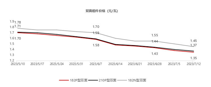 2023年上半年,光伏產(chǎn)業(yè)鏈各主材環(huán)節(jié)價(jià)格均呈大幅下跌趨勢(shì),從上游向下游(硅料-硅片-組件)的降幅依次均有遞減。據(jù)PV InfoLink數(shù)據(jù)顯示,以182雙面PERC組件價(jià)格為例,從5月初的1.7元/瓦跌至近期的1.35元/瓦。