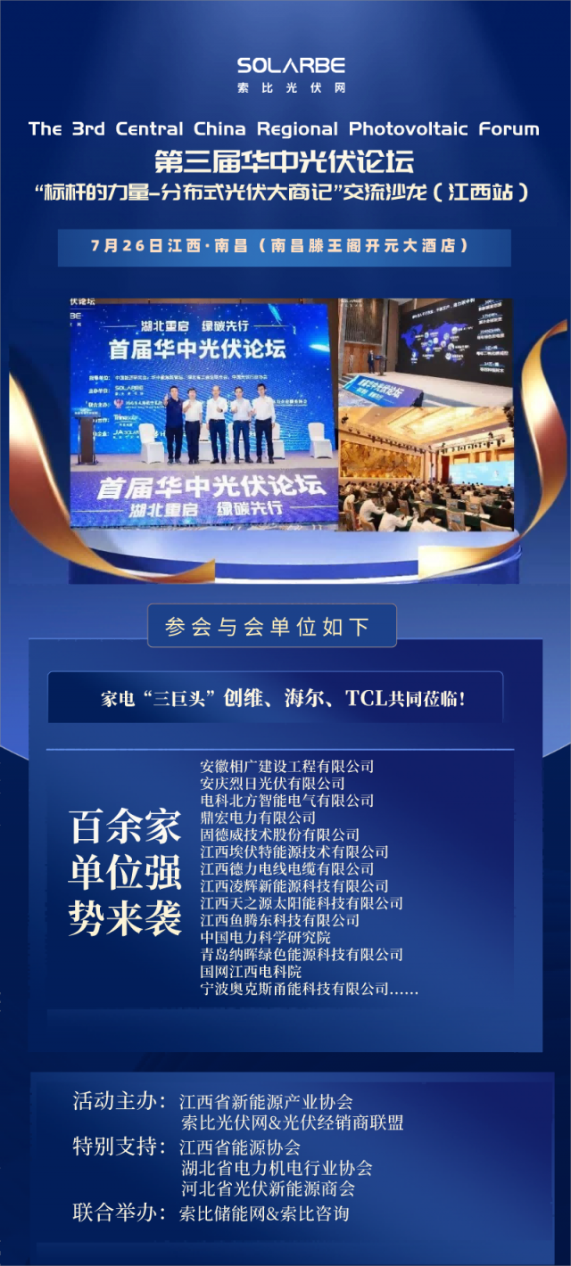 為了助力廣大光伏從業(yè)者進(jìn)一步探索華中地區(qū)光伏市場(chǎng)發(fā)展?jié)摿?,有的放矢,索比光伏網(wǎng)定于2023年7月26日在江西南昌舉辦第三屆華中光伏論壇暨“標(biāo)桿的力量--分布式光伏大商記”-江西站,誠(chéng)邀各位光伏同仁蒞臨交流!