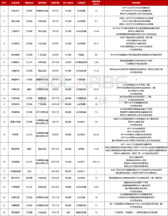 索比光伏網(wǎng)據(jù)公開數(shù)據(jù)統(tǒng)計,今年以來IPO獲得受理的光伏公司共有22家,包括3家太陽能電池企業(yè),光伏膠膜、光伏玻璃、逆變器、EPC企業(yè)各2家,還有多晶硅、光伏漿料、石英坩堝、接線盒等環(huán)節(jié)企業(yè),擬募資額合計超1285億元,其中華電新能以804.12億元的募資額創(chuàng)下目前A股新能源領域的最大規(guī)模IPO記錄。