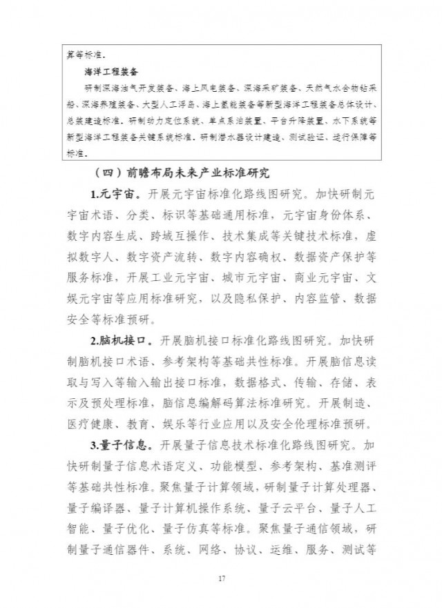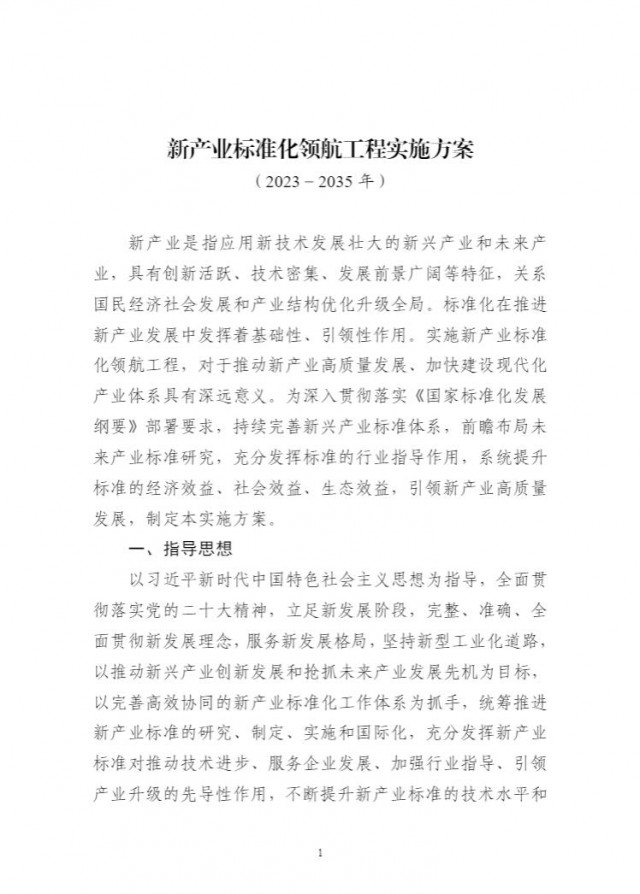 為貫徹落實《國家標準化發(fā)展綱要》,持續(xù)完善新興產業(yè)標準體系建設,前瞻布局未來產業(yè)標準研究,充分發(fā)揮標準的行業(yè)指導作用,引領新產業(yè)高質量發(fā)展,工業(yè)和信息化部、科技部、國家能源局、國家標準化管理委員會組織編制了《新產業(yè)標準化領航工程實施方案(2023─2035年)》?,F(xiàn)印發(fā)你們,請結合本地區(qū)、本行業(yè)實際,抓好貫徹落實。