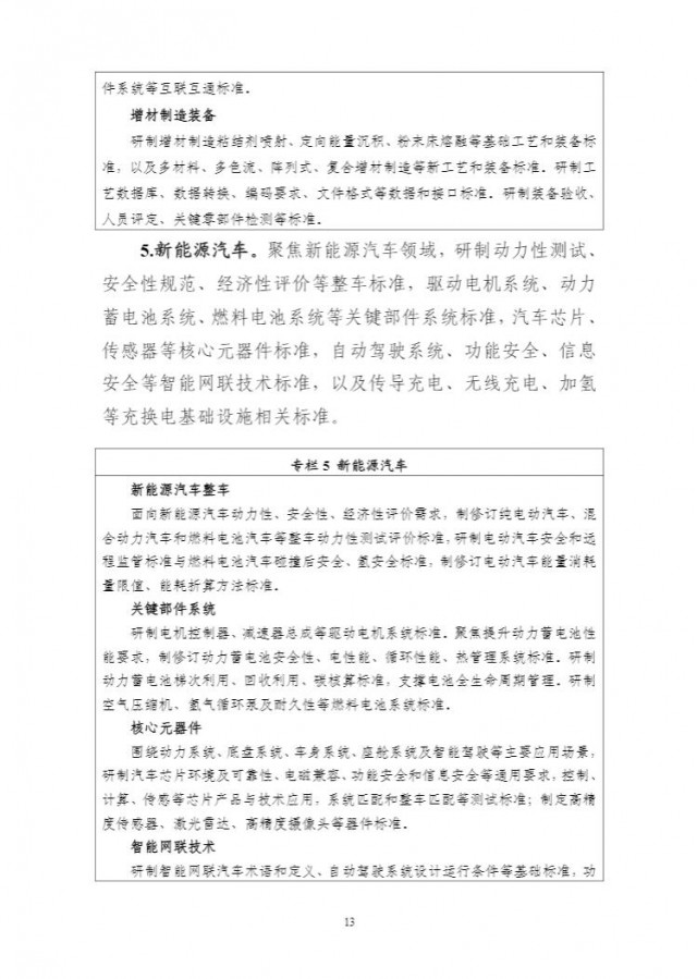 《方案》明確,在新能源汽車方面,聚焦新能源汽車領域,研制動力性測試、安全性規(guī)范、經濟性評價等整車標準,驅動電機系統(tǒng)、動力蓄電池系統(tǒng)、燃料電池系統(tǒng)等關鍵部件系統(tǒng)標準,汽車芯片、傳感器等核心元器件標準,自動駕駛系統(tǒng)、功能安全、信息安全等智能網聯(lián)技術標準,以及傳導充電、無線充電、加氫等充換電基礎設施相關標準。