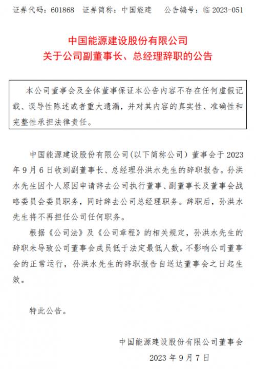 2023年9月6日,中國(guó)能建公告,孫洪水辭職,將不再擔(dān)任公司任何職務(wù)。
