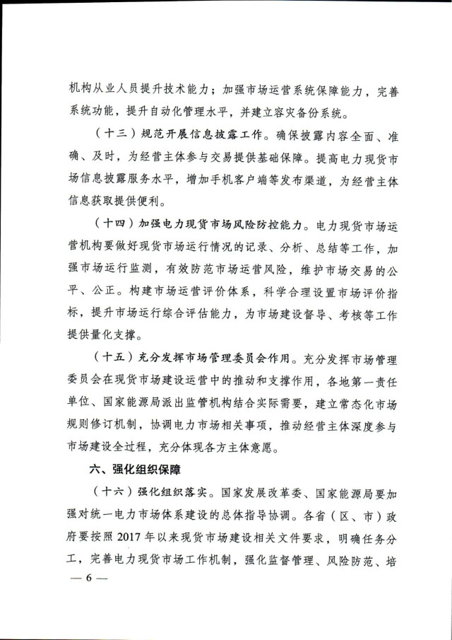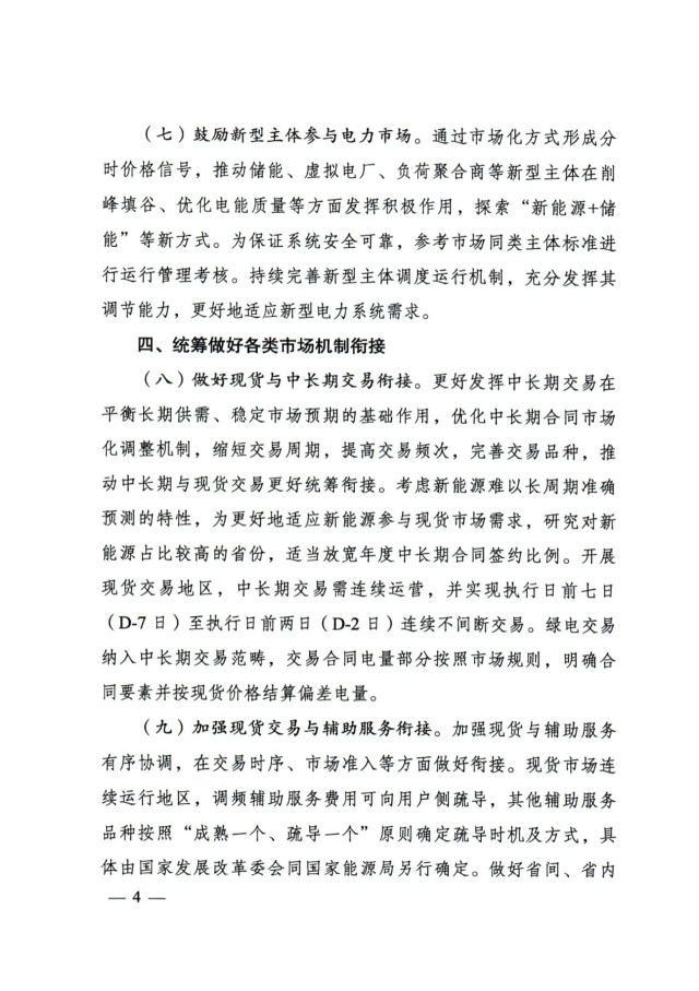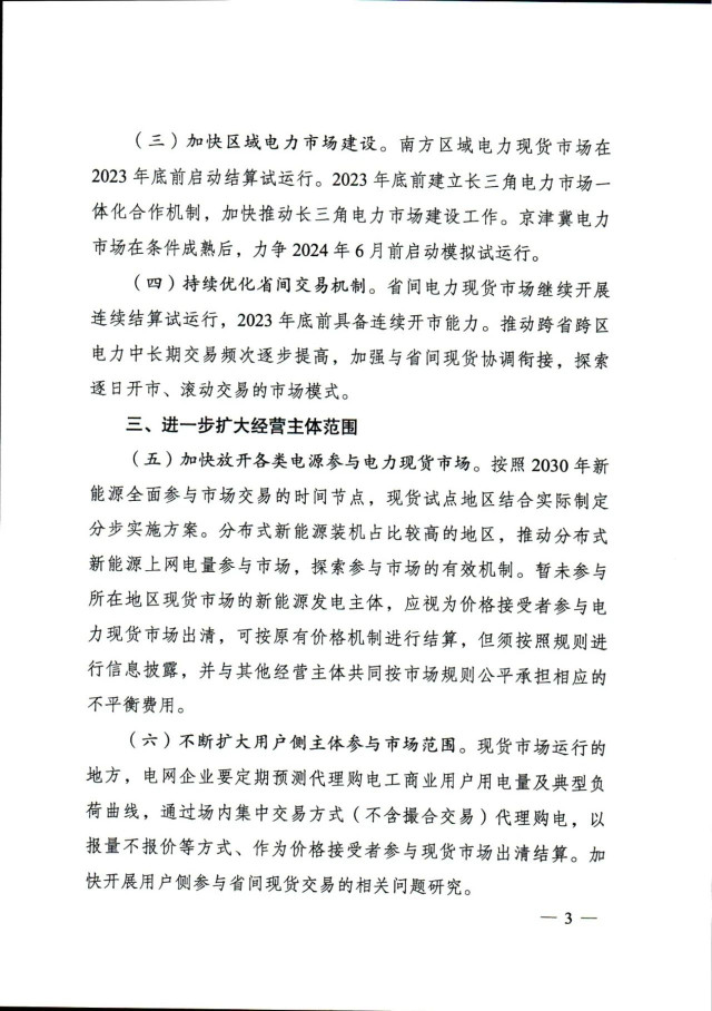 通知提出,加快放開各類電源參與電力現(xiàn)貨市場。按照2030年新能源全面參與市場交易的時間節(jié)點,現(xiàn)貨試點地區(qū)結(jié)合實際制定分步實施方案。分布式新能源裝機(jī)占比較高的地區(qū),推動分布式新能源上網(wǎng)電量參與市場,探索參與市場的有效機(jī)制。暫未參與所在地區(qū)現(xiàn)貨市場的新能源發(fā)電主體,應(yīng)視為價格接受者參與電力現(xiàn)貨市場出清,可按原有價格機(jī)制進(jìn)行結(jié)算,但須按照規(guī)則進(jìn)行信息披露,并與其他經(jīng)營主體共同按市場規(guī)則公平承擔(dān)相應(yīng)的不平衡費用。
