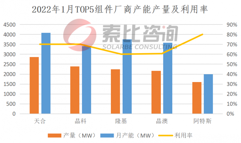 2022年1月,終端需求大幅上升,國內組件產(chǎn)量19.73GW,環(huán)比大增23.31%。按照產(chǎn)量排名,天合、晶科、隆基、晶澳、阿特斯位列前五,企業(yè)總產(chǎn)量11.27GW,占比57.12%,綜合開工率68.11%。預計2022年2月,海外需求還會有所提升,組件產(chǎn)量預計持平或小幅上漲。