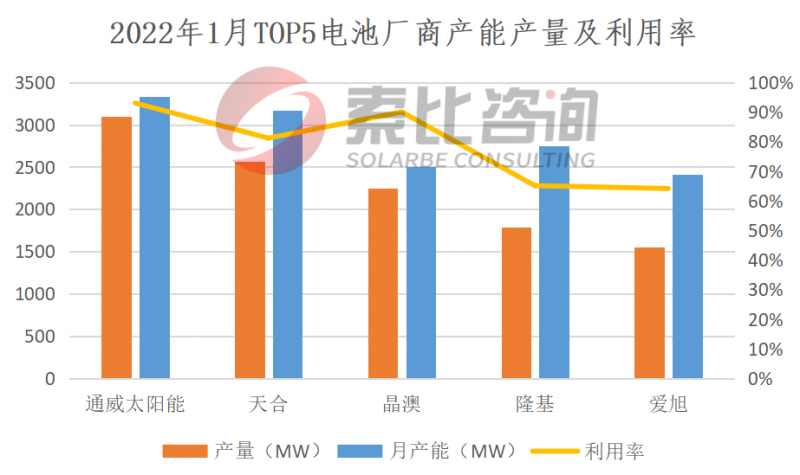 2022年1月,電池需求量明顯增加,國內一線企業(yè)開工率提升至7成。2022年1月國內硅片產(chǎn)量20.6GW,環(huán)比增加15.4%。按照產(chǎn)量排名,隆基、中環(huán)、晶科、晶澳、上機位列前五,企業(yè)總產(chǎn)量14.34GW,占比69.61%,綜合利用率70.45%。預計2月份硅片產(chǎn)量將繼續(xù)增加。從供應端來看,2月份基礎產(chǎn)量已達上限,受地震影響的部分產(chǎn)能加緊恢復。從需求端來看,終端需求遠超預期、海外市場火熱,市場轉向供不應求的局面。