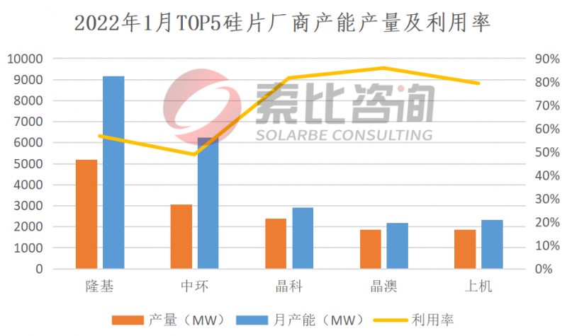 2022年1月,國內12家多晶硅企業(yè)在產(chǎn),大全和永祥新增產(chǎn)能陸續(xù)釋放,產(chǎn)量再創(chuàng)新高。1月份國內多晶硅產(chǎn)量為5.2萬噸(約20.54GW),環(huán)比增長6.56%。按照產(chǎn)量排名,永祥、協(xié)鑫、大全、新特、東方希望位列前五,企業(yè)總產(chǎn)量4.51萬噸,占比86.7%,綜合利用率90.6%。索比咨詢預期2月份硅料產(chǎn)量繼續(xù)小幅上漲。從供應端來看,1月份新特、大全、永祥、協(xié)鑫擴產(chǎn)增量繼續(xù)釋放。從需求端來看,國內和海外市場一季度終端需求受訂單延期和免稅期截止等因素影響,相較往年將有一定程度增長;此外,硅片企業(yè)迅速提升開工率,硅料需求短期內大幅增加。