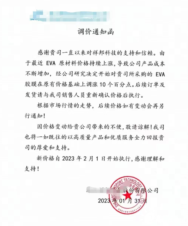 感謝貴司一直以來對祥邦科技的支持和信賴。由于最近 EVA 原材料價格持續(xù)上漲,導(dǎo)致公司產(chǎn)品成本不斷增加,經(jīng)公司研究決定開始對貴司所采購的 EVA膠膜在原有價格基礎(chǔ)上調(diào)漲 10 個百分點(diǎn)。后續(xù)訂單及發(fā)貨請與我司銷售人員重新確認(rèn)價格后執(zhí)行。
