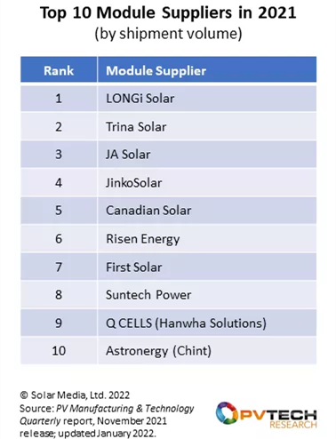 本網(wǎng)訊  1月13日,全球知名光伏媒體PV-Tech發(fā)布《2021年全球組件供應(yīng)商top10》排名,天合光能2021年組件出貨量全球排名位居第二!