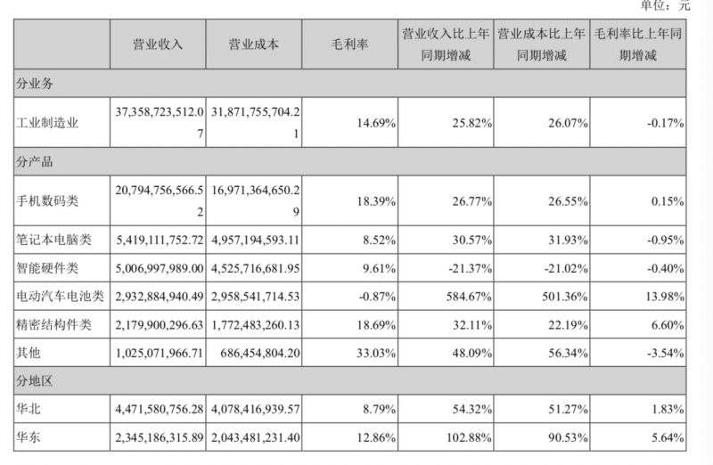 具體到欣旺達(dá)旗下各大業(yè)務(wù)分類,欣旺達(dá)的業(yè)務(wù)主要是消費電子類業(yè)務(wù)(包括手機(jī)數(shù)碼類、筆記本電腦類和智能硬件類)和汽車及動力電池類業(yè)務(wù)組成。而目前欣旺達(dá)的總體收入主要來源依然是消費電子業(yè)務(wù),2021年實現(xiàn)營業(yè)收入312.16億元,同比增長16%,占比達(dá)到83.57%,其中手機(jī)數(shù)碼類的毛利率維持在18.39%,近3年變化不大。