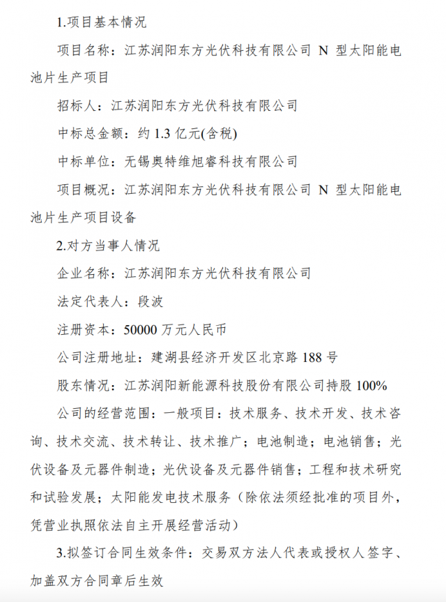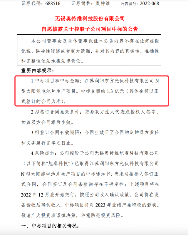 奧特維公司控股子公司中標潤陽東方光伏科技N型電池片生產(chǎn)項目,中標金額約1.3億元。