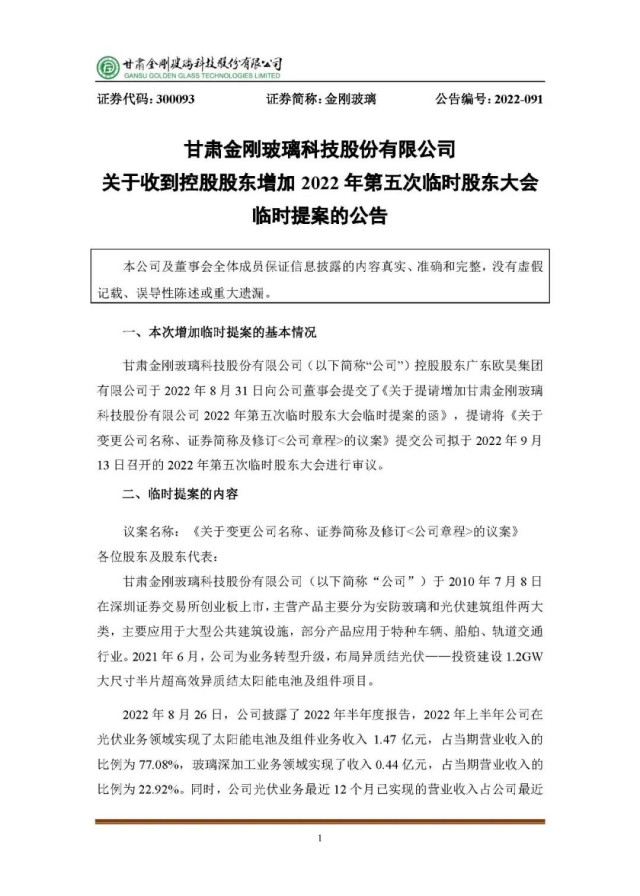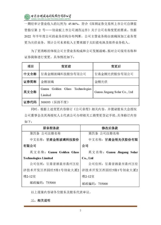 為了更清晰的體現(xiàn)公司主營業(yè)務構成和公司發(fā)展戰(zhàn)略,擬對公司現(xiàn)有名稱和證券簡稱進行變更。上市公司名稱由“甘肅金剛玻璃科技股份有限公司”變更為“甘肅金剛光伏股份有限公司”,證券簡稱由“金剛玻璃”改為“金剛光伏”,英文全稱由“Gansu Golden Glass Technologies Limited”改為“Gansu Jingang Solar Co., Ltd”。公司董事會將在兩日內(nèi)就該事項進行審議。