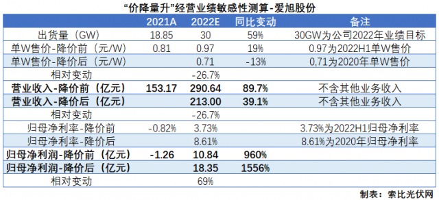 首先來(lái)看愛(ài)旭股份,假設(shè)2022年電池片單W售價(jià)下降至2020年的水平,同時(shí)盈利能力恢復(fù)至同期水平,按照全年出貨30GW計(jì)算,則營(yíng)收規(guī)模相比于降價(jià)前下降27%,營(yíng)收增速由89.7%下降至39.1%。不過(guò),受益于盈利能力的修復(fù),經(jīng)營(yíng)業(yè)績(jī)暴增1556%,相較于降價(jià)前的960%大幅提升。