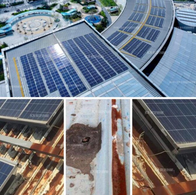 若只依靠彩鋼瓦本身的屋面,很容易因為涂層厚度不夠,加之紫外線、雨水、光合作用等自然因素的侵蝕,造成屋面彩鋼瓦接縫處開裂、鉚釘松動生銹、屋面銹蝕擴大、瓦脊銹蝕銹穿導致屋面出現(xiàn)滲水漏水的情況。同時因其坡度小,可能會造成雨水排泄不暢、積水超過彩鋼瓦接縫高度或鉚釘孔高度及溝沿瓦而導致銹損滲漏。而工廠生產(chǎn)過程中排放的酸性、堿性等氣體長期與屋面接觸,也會腐蝕鋼結構,加速銹蝕、穿孔導致滲漏。