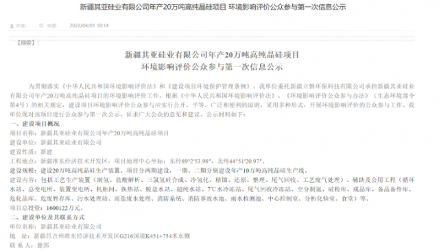 根據(jù)該項目此前公示的第一次環(huán)評顯示,項目建設單位為其亞鋁業(yè)集團子公司新疆其亞鋁電有限公司。工程位于新疆準東經(jīng)濟技術開發(fā)區(qū)。建設規(guī)模為20萬噸高純晶硅生產(chǎn)裝置。項目分兩期建設,一期、二期分別建設年產(chǎn)10萬噸高純晶硅生產(chǎn)線。