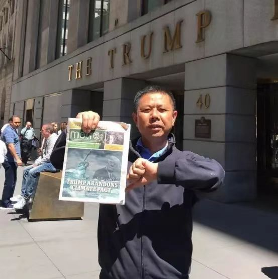 2017年,在特朗普宣布退出巴黎氣候協(xié)定的第二天,憤怒的高紀(jì)凡便一個(gè)人跑到紐約特朗普大廈門(mén)前,右手拿著剛剛印出來(lái)的報(bào)紙,左手大拇指朝下,抗議的同時(shí)還不忘招賢納士:歡迎全球致力于低碳技術(shù)創(chuàng)新的人到中國(guó)發(fā)展。