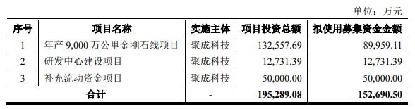 據(jù)悉,本次聚成科技擬募資15.27億元,其中約9億元擬用于年產(chǎn)9000萬公里金剛石線項(xiàng)目、1.27億元用于研發(fā)中心建設(shè)項(xiàng)目、5億元用于補(bǔ)充流動(dòng)資金項(xiàng)目。
