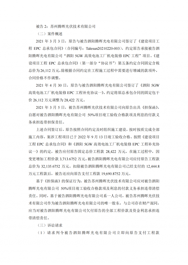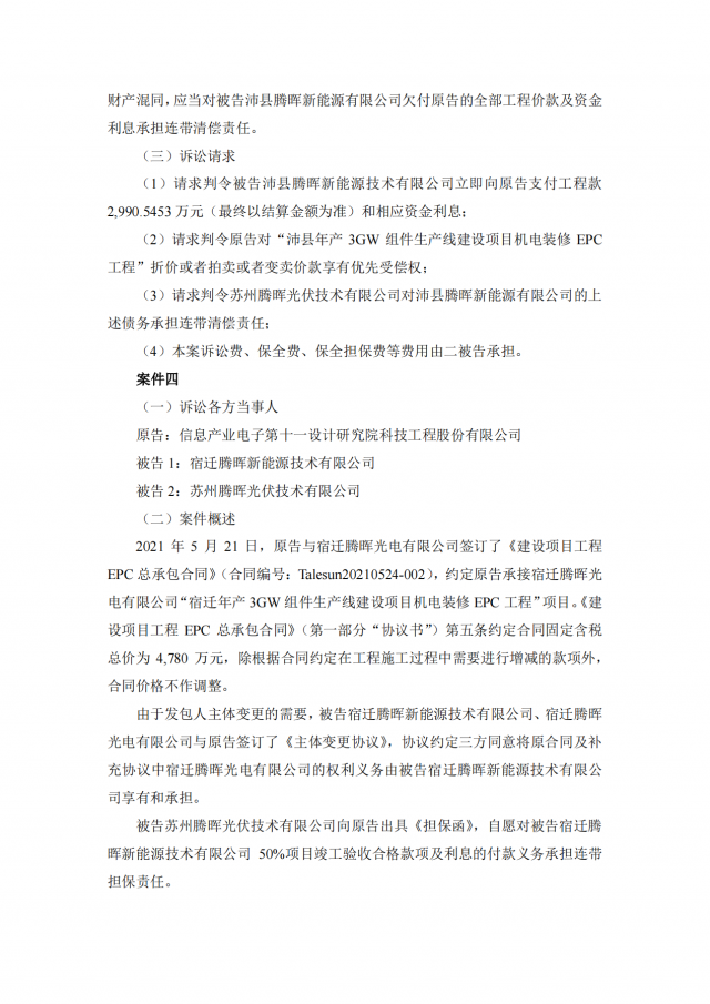 1月7日,太極實(shí)業(yè)發(fā)布公告,公司子公司信息產(chǎn)業(yè)電子第十一設(shè)計研究院科技工程股份有限公司(以下簡稱“十一科技”)與蘇州騰暉光伏技術(shù)有限公司(以下簡稱“蘇州騰暉”)及其子公司存在建設(shè)工程施工合同糾紛,十一科技已向法院提起訴訟及財產(chǎn)保全。本次相關(guān)訴訟案件共6件,合計涉案金額約3.88億元。目前,上述六起案件僅一件已被法院受理,其余訴訟案件,十一科技均已向法院遞交訴訟材料,目前正處于受理中。