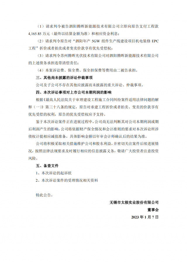 太極實(shí)業(yè)表示,鑒于本次訴訟案件正在進(jìn)展過程中,公司尚無法判斷其對公司本期利潤或期后利潤產(chǎn)生的影響,公司將依據(jù)財產(chǎn)保全情況和會計準(zhǔn)則的要求對本次訴訟所涉?zhèn)鶛?quán)計提相應(yīng)減值準(zhǔn)備,具體影響金額以年審會計師確認(rèn)后的結(jié)果為準(zhǔn)。值得注意還有,此前8月5日,太極實(shí)業(yè)子公司信息產(chǎn)業(yè)電子第十一設(shè)計研究院科技工程股份有限公司(以下稱十一科技)位于烏蘭察布市、鄂爾多斯市、錫林郭勒盟發(fā)展改革委的五個光伏電站項(xiàng)目,共計裝機(jī)115 MW,因擅自變更投資主體,上網(wǎng)電價批復(fù)文件被廢止,其光伏補(bǔ)貼遭核查后恐退回,太極實(shí)業(yè)也將損失超3億凈利。