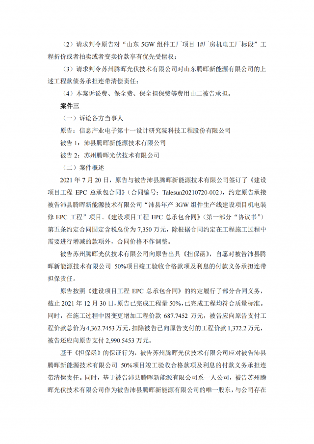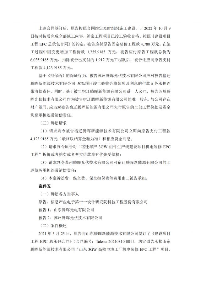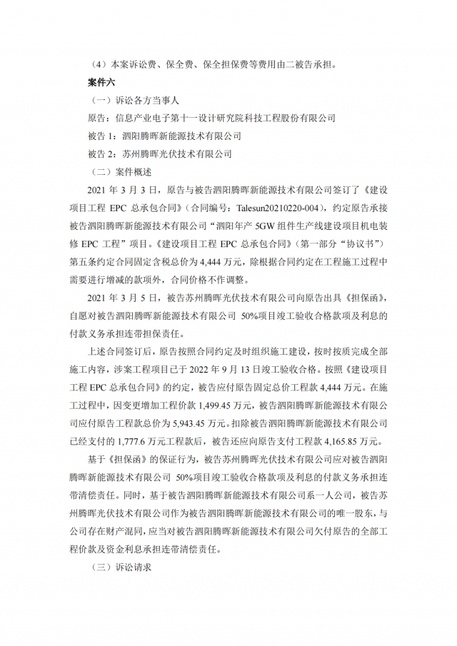 2020年~2021年期,十一科技與蘇州騰暉的六家全資子公司泗陽騰暉光電有限公司、山東騰暉新能源技術(shù)有限公司、沛縣騰暉新能源技術(shù)有限公司、宿遷騰暉新能源技術(shù)有限公司、山東騰暉光電有限公司、泗陽騰暉新能源技術(shù)有限公司簽訂了多筆項(xiàng)目施工承包合同,但上述六家企業(yè)并未全部付清工程款。