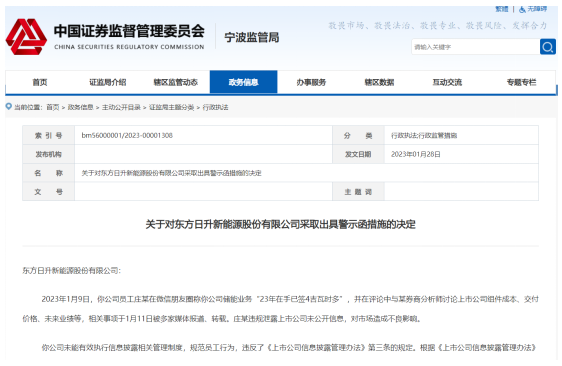 1月28日,寧波證監(jiān)局官網(wǎng)披露的一則《關(guān)于對東方日升新能源股份有限公司采取出具警示函措施的決定》顯示,東方日升員工莊某在微信朋友圈違規(guī)泄露上市公司未公開信息,對市場造成不良影響。因公司未能有效執(zhí)行信息披露相關(guān)管理制度,規(guī)范員工行為,違反了《上市公司信息披露管理辦法》第三條的規(guī)定,寧波證監(jiān)局決定對東方日升采取出具警示函的行政監(jiān)管措施。