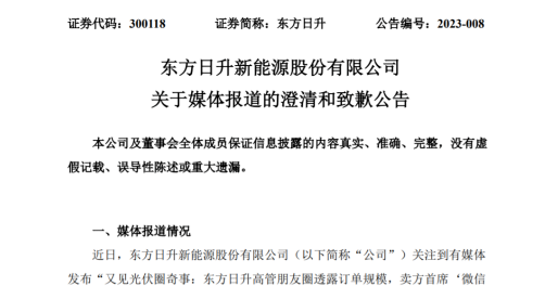雖然朋友圈留存的時間不長,但其內(nèi)容還是被有關(guān)媒體捕捉到并迅速曝光。就此,東方日升于1月12日就相關(guān)媒體報道發(fā)布澄清和致歉公告,將涉及的有關(guān)言論的具體情況、公司儲能業(yè)務(wù)訂單情況及電池組件非硅成本情況進行了說明。公告稱“莊英宏發(fā)布的相關(guān)言論均系其個人行為,不代表公司立場。”“莊英宏所述‘23年在手已簽4吉瓦時多了’為其與公司儲能業(yè)務(wù)相關(guān)同事交流了解后作出的個人理解,口徑為公司雙簽訂單量與意向在談訂單量的合并量。”