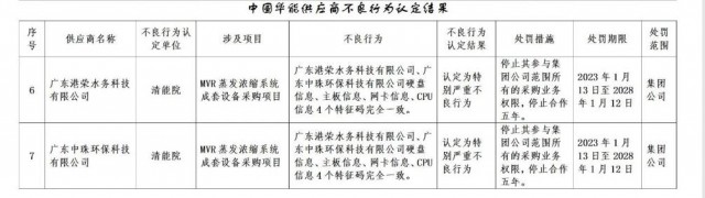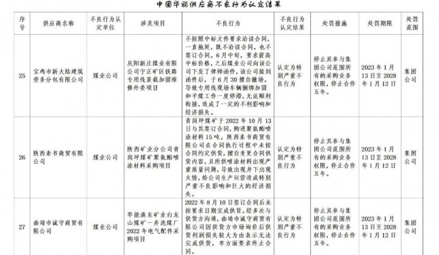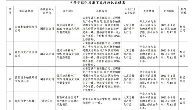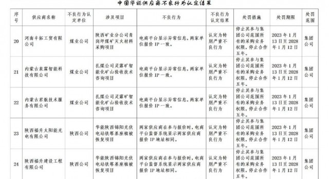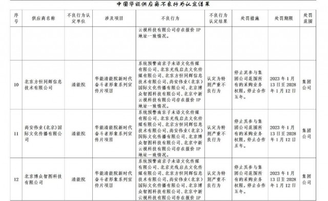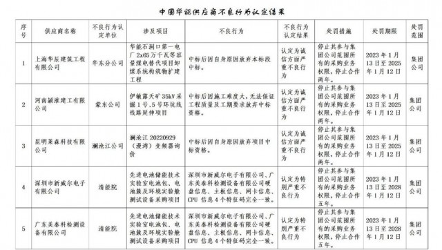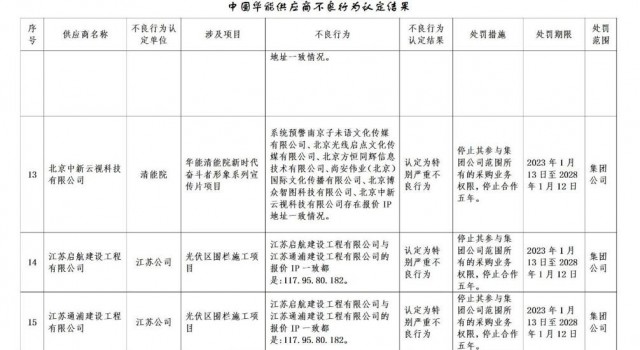 公告稱:為促進誠信履約,保證供應商產(chǎn)品質(zhì)量、服務水平,依據(jù)《中國華能集團有限公司供應商管理辦法》的有關(guān)規(guī)定,對發(fā)生誠信方面問題的供應商進行了處理。