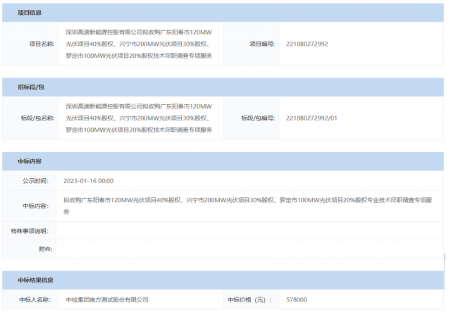 1月30日,深圳高速新能源控股有限公司公示了擬收購(gòu)廣東陽(yáng)春市120MW光伏項(xiàng)目40%股權(quán)、興寧市200MW光伏項(xiàng)目30%股權(quán)、羅定市100MW光伏項(xiàng)目20%股權(quán)技術(shù)盡職調(diào)查的中標(biāo)候選人,中檢集團(tuán)南方測(cè)試股份有限公司以57.8萬(wàn)元的報(bào)價(jià)中標(biāo)。