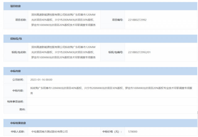 1月30日,深圳高速新能源控股有限公司公示了擬收購(gòu)廣東陽(yáng)春市120MW光伏項(xiàng)目40%股權(quán)、興寧市200MW光伏項(xiàng)目30%股權(quán)、羅定市100MW光伏項(xiàng)目20%股權(quán)技術(shù)盡職調(diào)查的中標(biāo)候選人,中檢集團(tuán)南方測(cè)試股份有限公司以57.8萬(wàn)元的報(bào)價(jià)中標(biāo)。