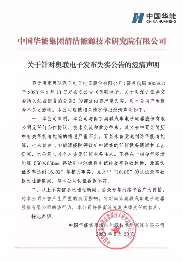 華能清潔能源研究院發(fā)布針對(duì)奧聯(lián)電子發(fā)布失實(shí)公告的澄清聲明,公司聲明,公司與南京奧聯(lián)汽車電子電器股份有限公司無(wú)任何合作協(xié)議、技術(shù)交流和業(yè)務(wù)往來(lái)。