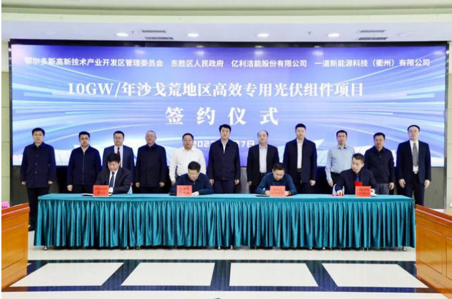3月7日,在內(nèi)蒙古風(fēng)光氫儲產(chǎn)業(yè)集群重鎮(zhèn)鄂爾多斯東勝區(qū),億利潔能股份有限公司與鄂爾多斯高新技術(shù)產(chǎn)業(yè)開發(fā)區(qū)管委會、東勝區(qū)人民政府、一道新能源科技(衢州)有限公司成功簽約10GW沙戈荒地區(qū)高效專用光伏組件項目。